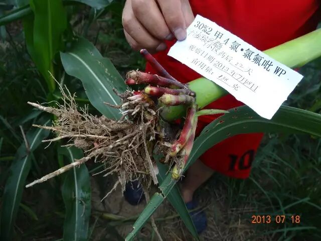 事例二、在华星公司开展的破坏性试验中,在玉米3-5叶期按常量使用烟嘧磺隆时,加入了常量的毒死蜱乳油,结果试验处理区玉米80%均出现明显药害,其中30%株以上玉米苗整株枯黄,心叶腐烂。